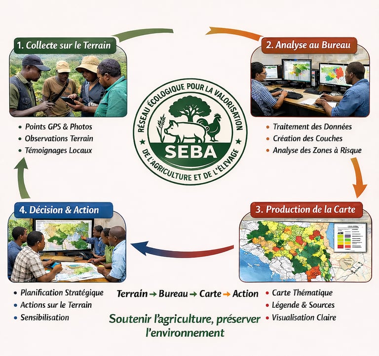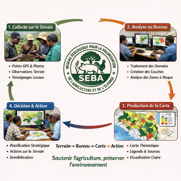 Cartographie des ressources naturelles, l’inventaire de la biodiversité et l’appui à la planification de projets agricoles et environnementaux. L’organisation fait des analyses spatiales pour soutenir la prise de décision.